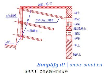 当场地为可塑直至硬塑的粘土层,基坑深度不大于15m时,可采用后仰式锚拉钢桩支护结构 当要求支护结构具有止水作用时,可增设止水帷幕。
