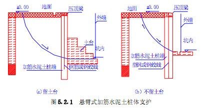当场地为混合土层或砂性土层,基坑深度不大于6m,基坑内墙脚处具备留土台的条件时,可采用悬臂式加筋(预应力或非预应力)水泥土桩锚支护。