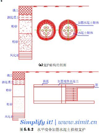 当在含水量丰富的砂土或软土层中采用暗挖施工隧道或地下工程时,可采用水平咬合加筋水泥土拱棚支护结构。