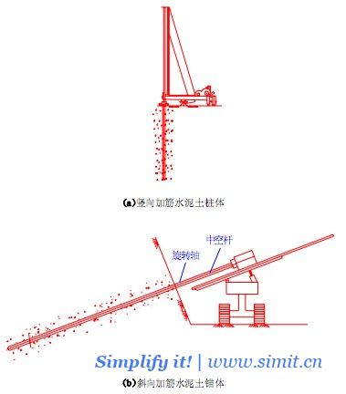 根据成型方向,加筋水泥土桩锚体可分为竖向、斜向或水平向三种型式,见下图:
