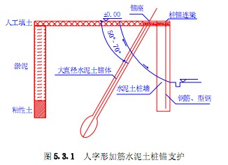 当场地为软土、素填土、各类砂性土,基坑深度不大于6m,基坑周围不具备放坡条件且地下水位较高时,可采用人字形加筋水泥土桩锚支护结构。
