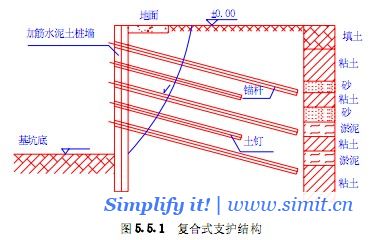 在较好的层状土层中,可采用土钉或锚杆与加筋水泥土桩墙相结合形成复合式支护结构。