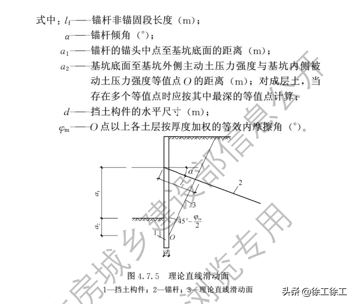 在这条说明里边,清楚地指出“非锚固段是理论滑动面以内的部分”,那么,矛盾就出现了。很显然,这条说明直接就否定了正文4.7.5条对非锚固段的定义,根据条文说明,似乎lf是自由段长度才对。