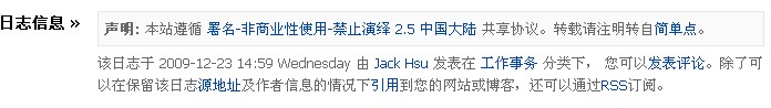 1、在“日志信息”中增加了版权声明,默认的版权协议为《署名-非商业性使用 -禁止演绎 2.5 中国大陆 》协议,大家可以自行修改。