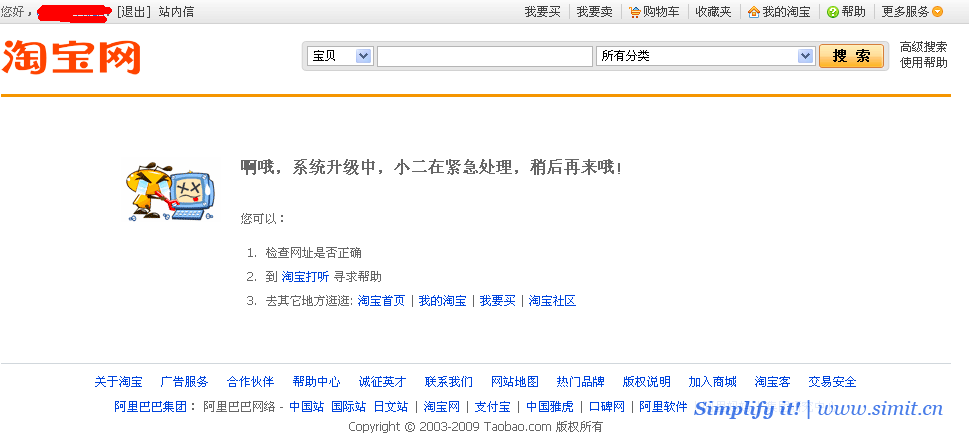 最近几天的上网高峰时段——晚上7点到10点,马云的淘宝网最重要的工具——搜索引擎挂了,无法提供搜索服务,在搜索框中输入关键字之后,长时间无响应,大概2分钟之后就转到一个“啊哦,系统升级中,小二在紧急处理,稍后再来哦! ”的页面。